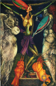 Crucification by Ernst Fuchs (1950). © This artwork may be protected by copyright. It is posted on the site in accordance with fair use principles.