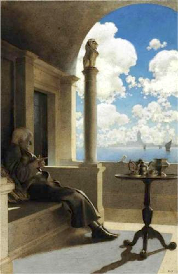 The Cardinal Archbishop Sat on His Shaded Porch by Maxfield Parrish (1901). © The Cardinal Archbishop Sat on His Shaded Porch by Maxfield Parrish. This artwork may be protected by copyright. It is posted on the site in accordance with fair use principles.