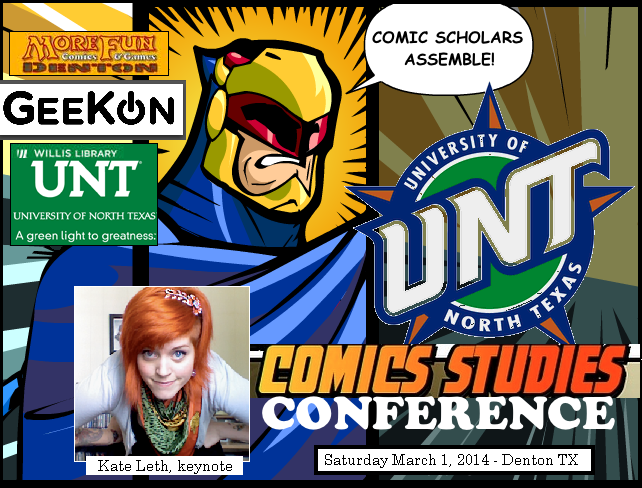 The University of North Texas Center for Interdisciplinarity invites paper submissions to the 2014 UNT Comics Studies Conference to be held March 1, 2014 in Denton, TX from 10am-6pm. Debuting in 2011, the UNT Comics Studies Conference focuses on interdisciplinary approaches to graphic narrative or sequential arts and welcomes competitive paper submissions to participate in panel discussions and roundtable sessions exploring the critical and educational applications of comics or graphic novels. Held in conjunction with the UNT GeeKon week (full schedule here), this year’s keynote speaker is KATE LETH, webcomic creator of fan-favorite KATE OR DIE! and writer for Adventure Time, whose 4pm talk is on “The Geek Grrrl’s Guide to Making Your Own Webcomics!”