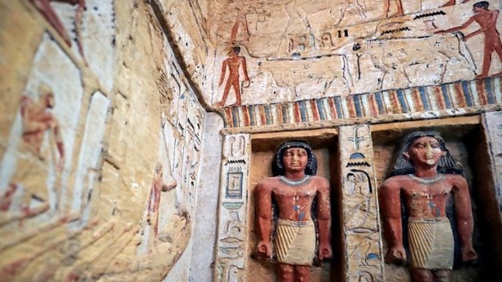 The tomb, found in the Saqqara pyramid complex near Cairo, is filled with colourful hieroglyphs and statues of pharaohs. Decorative scenes show the owner, a royal priest named Wahtye, with his mother, wife and other relatives.